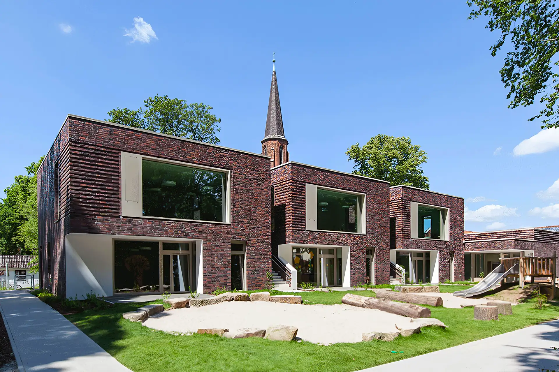 Neubau für drei Kindergarten- und drei Krippengruppen in zweigeschossiger Massivbauweise (Mauerwerk / Stahlbeton) mit Flachdach und Fassade mit Verblendmauerwerk.Außenliegende Fluchttreppenläufe als Zäsur innerhalb des Obergeschosses.